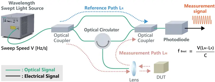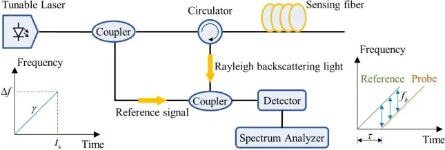 光频域反射技术 (OFDR) 是一种非破坏性成像技术,它利用光纤干涉仪中的频率扫描光源对样品进行高速轴向扫描,无需机械运动即可实现深度分辨成像。它通过对采集的信号进行离散傅里叶变换来提取图像,从而实现高分辨率和快速成像。